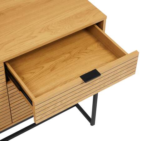 Añade un toque de elegancia industrial a tu interior con este bonito aparador. Diseñado con una robusta estructura de acero, este mueble combina durabilidad y estilo, perfecto para usuarios que buscan un almacenamiento funcional conservando una estética contemporánea. Con unas medidas de 160 cm de largo, 40 cm de fondo y 85 cm de alto, este aparador está optimizado para maximizar el espacio y al mismo tiempo proporciona una impresionante capacidad de almacenamiento. Las dos puertas batientes se abren a un gran espacio, ideal para guardar platos, libros u objetos decorativos, mientras que los tres cajones proporcionan fácil acceso a tus pertenencias más pequeñas. Las puertas de entrada están fabricadas en MDF con decoración en melamina, aportando un acabado elegante y moderno, mientras que el resto de paneles de partículas también están decorados con melamina, garantizando coherencia visual. Con certificación FSC® MIX, este mueble cumple con las normas medioambientales, permitiéndole amueblar su espacio con conciencia. Con una altura de pies de 40 cm, este conjunto da una impresión de ventilación y facilita la limpieza. Su capacidad de carga máxima de 50 kg te permite acomodar tus objetos más pesados sin comprometer la seguridad. Ya sea que desee embellecer su salón, su comedor o su oficina, este aparador de diseño industrial se convertirá rápidamente en el elemento central de su decoración, combinando practicidad y estilo.