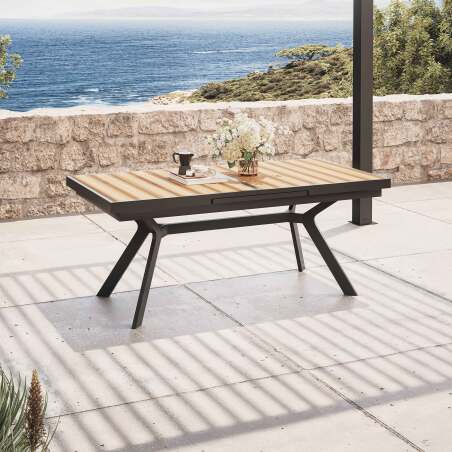 Aporta un toque de elegancia y convivencia a tu espacio exterior con nuestra mesa de jardín extensible. Diseñada para acomodar fácilmente sus comidas al aire libre, esta mesa tiene una longitud modular de 187 a 250 cm, así como un ancho de 90 cm y una altura de 77 cm, lo que le permitirá acomodar cómodamente a familiares y amigos durante sus reuniones. Su robusta estructura de aluminio garantiza una durabilidad excepcional, mientras que la tapa de aluminio efecto madera, obtenida por transferencia de calor, añade una estética cálida y moderna, perfecta para un estilo escandinavo. El revestimiento de epoxi satinado protege la mesa de las inclemencias del tiempo y los arañazos, garantizando un uso prolongado manteniendo una apariencia refinada. La expansión automática facilita el cambio de un tamaño a otro, permitiéndote adaptarte rápidamente a las necesidades de tus invitados sin esfuerzo. Ya sea para una barbacoa en verano, una cena al aire libre o momentos de convivencia, esta mesa extensible es el elemento ideal para transformar su terraza o su jardín en un verdadero espacio de vida al aire libre. Regálate un mobiliario tan práctico como estético, que hará de cada comida un momento inolvidable.