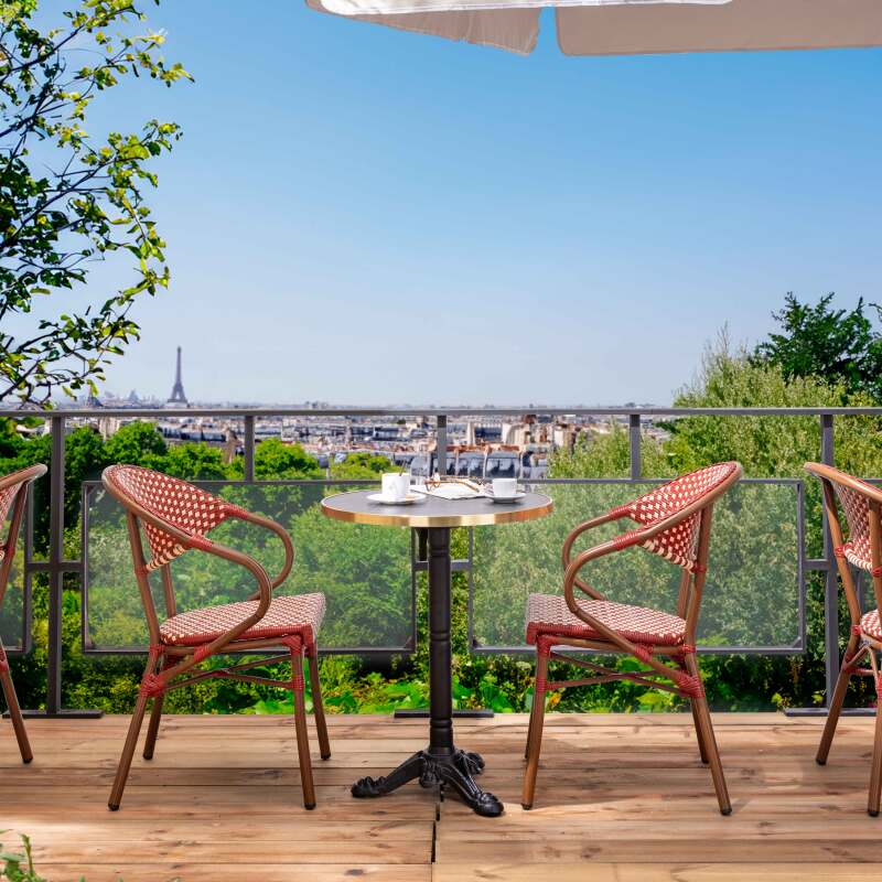• Descripción Mesa de terraza ⌀60 cm reclinable laminada y 2 sillas bistro en aluminio y ratán sintético