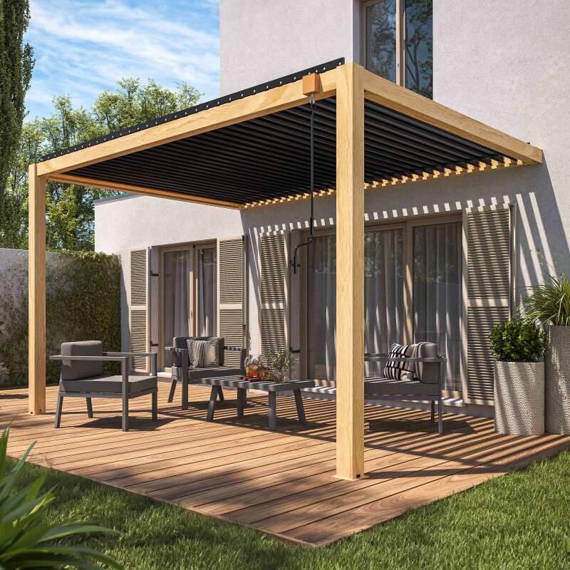Descubra la magnífica pérgola bioclimática adosada de 3 x 4 m, una auténtica joya para su espacio exterior. Cuidadosamente diseñada, esta pérgola combina la elegancia del aluminio con la calidez de la madera decorativa para un resultado a la vez moderno e intemporal. Con una superficie de 12 m², esta pérgola ofrece un espacio generoso para un rincón de relajación o una zona de convivencia al aire libre. Gracias a su accionamiento manual por manivela, podrá regular fácilmente la apertura de las lamas para controlar la luz y la ventilación a su gusto. Ya haga viento, llueva o haga sol, esta pérgola está preparada para todo gracias a sus robustas patas de 2 x 120 mm de aluminio de 1,4 mm de grosor. Los 4 canalones integrados evacuan eficazmente el agua de lluvia a través de las patas, manteniendo su espacio exterior seco y agradable. Con unas dimensiones de 404 cm de longitud, 300 cm de profundidad y 258 cm de altura, esta pérgola ofrece una elegante zona de sombra para disfrutar de los días soleados. Sus 31 lamas, una de ellas motorizada, permiten un sutil juego de luces y una perfecta adaptación a sus preferencias. Su sólida base de 170 x 170 x 68 mm garantiza una instalación segura y duradera, ofreciéndole una estructura fuerte y resistente para realzar su jardín. Esta pérgola bioclimática adosada es mucho más que un simple refugio, es una verdadera invitación a relajarse y disfrutar, añadiendo un toque de sofisticación y elegancia a su espacio exterior.