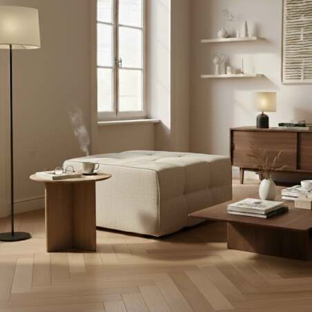 El puf SNUGGY combina comodidad y diseño con sus generosas dimensiones de 83 x 83 x 40 cm y una altura de asiento de 42 cm, ideal para una persona. Su estructura consta de un relleno de espuma de alta resiliencia (32 kg/m³) combinado con muelles ensacados, que garantizan sujeción y durabilidad óptimas, y descansa sobre una base antideslizante para mayor estabilidad. El puf está tapizado en una elegante y resistente tela con efecto lino (95 % poliéster, 5 % nailon, 340 g/m²), ofreciendo una textura suave y agradable y un cuidado fácil. Robusto, soporta un peso máximo de 110 kg. Para mayor comodidad, se entrega envasado al vacío para facilitar su transporte y manipulación. Perfecto para complementar un salón o una zona de relax, el puf SNUGGY se integra a la perfección con los módulos y conjuntos SNUGGY, y también puede utilizarse como chaise longue, ofreciendo una solución modular y personalizada que combina robustez, comodidad y estilo contemporáneo.