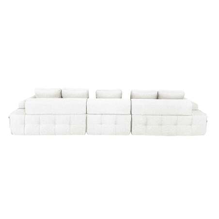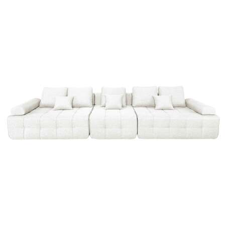 El sofá SNUGGY de 5 plazas consta de dos módulos modulares (282 x 112 x 65 cm) de fácil montaje, acompañados de un módulo central (83 x 112 x 66 cm) incluido, que permite ampliarlo con un asiento adicional para un espacio aún más acogedor y espacioso. Una vez montados, los tres módulos ofrecen un sofá de aproximadamente 365 cm de ancho, 112 cm de profundidad y 66 cm de alto, con una altura de asiento de 41 cm. Su estructura, que combina espuma de alta resiliencia (32 kg/m³) y muelles ensacados con base antideslizante, garantiza un confort duradero y una excelente estabilidad. Revestido en tejido efecto lino (95 % poliéster, 5 % nailon) de 340 g/m², aporta un toque elegante y natural a su interior. El cojín, el respaldo y las fundas decorativas son desenfundables y lavables para un fácil mantenimiento. Con 222 cm de ancho sin reposabrazos y 56,5 cm de alto, este sofá SNUGGY ofrece la comodidad ideal para toda la familia. Otros módulos SNUGGY también están disponibles por separado, lo que le permite personalizar y adaptar su espacio a sus necesidades.